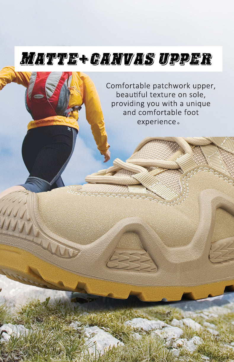 This is a professional tactical boot designed for outdoor activities. The upper is made of a mix of high-quality wear-resistant leather and high-strength fabric, which is durable and has good breathability. The boot body is designed to fit the curves of the foot and provide a comfortable wrapping feeling. The laces are made of high-strength nylon with metal lace holes, allowing you to adjust the tightness according to your needs. The toe section is reinforced to protect the toes from impact injuries. The height of the boot is moderate, which can provide some ankle support without hindering the flexible movement of the foot. The sole is made of a special rubber material with excellent anti-slip properties and abrasion resistance.
