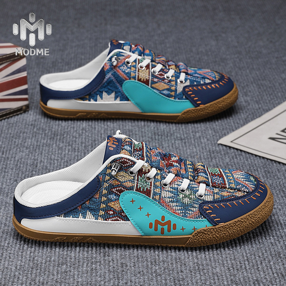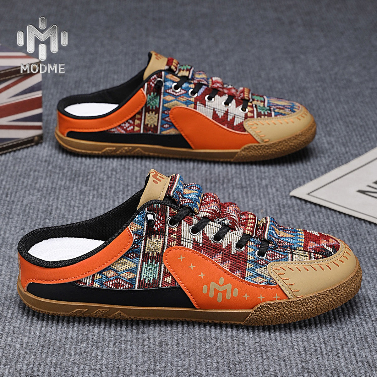 This casual shoe cleverly combines different materials to create a unique look. The upper is made of fabric with distinctive ethnic-inspired patterns, adding a rich cultural and artistic flair to the shoe. The leather accents and patchwork design further enhance the shoe's elegance and dimensionality. The simple metal lace eyelets not only improve the durability of the laces but also add a touch of modern sophistication. The thick sole provides stable support for comfortable walking.